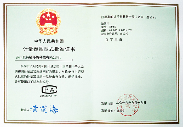TM-6S濁度計正式獲得由昆山市市場監督管理局頒發的《中華人民共和國制造計量器具許可證》。